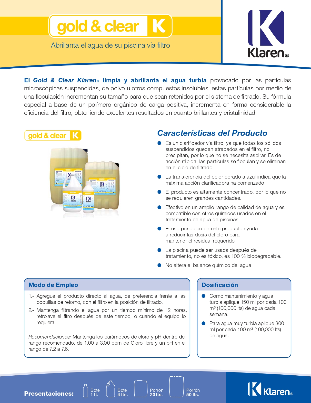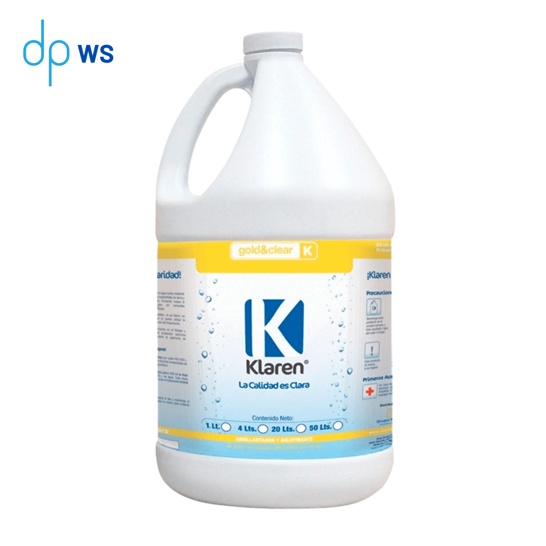 El Gold & Clear Klaren® limpia y abrillanta el agua turbia provocado por las partículas microscópicas suspendidas, de polvo u otros compuestos insolubles, estas partículas por medio de una floculación incrementan su tamaño para que sean retenidos por el sistema de filtrado. Su fórmula especial a base de un polímero orgánico de carga positiva incrementa en forma considerable la eficiencia del filtro, obteniendo excelentes resultados en cuanto brillantes y cristalinidad.